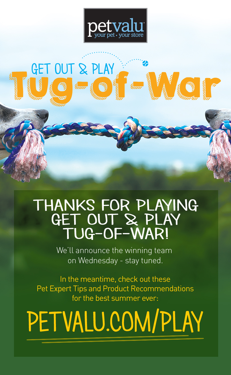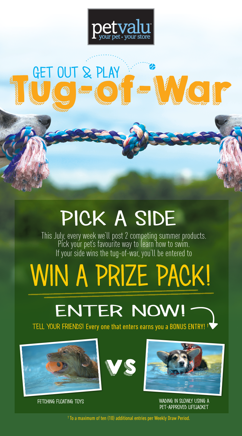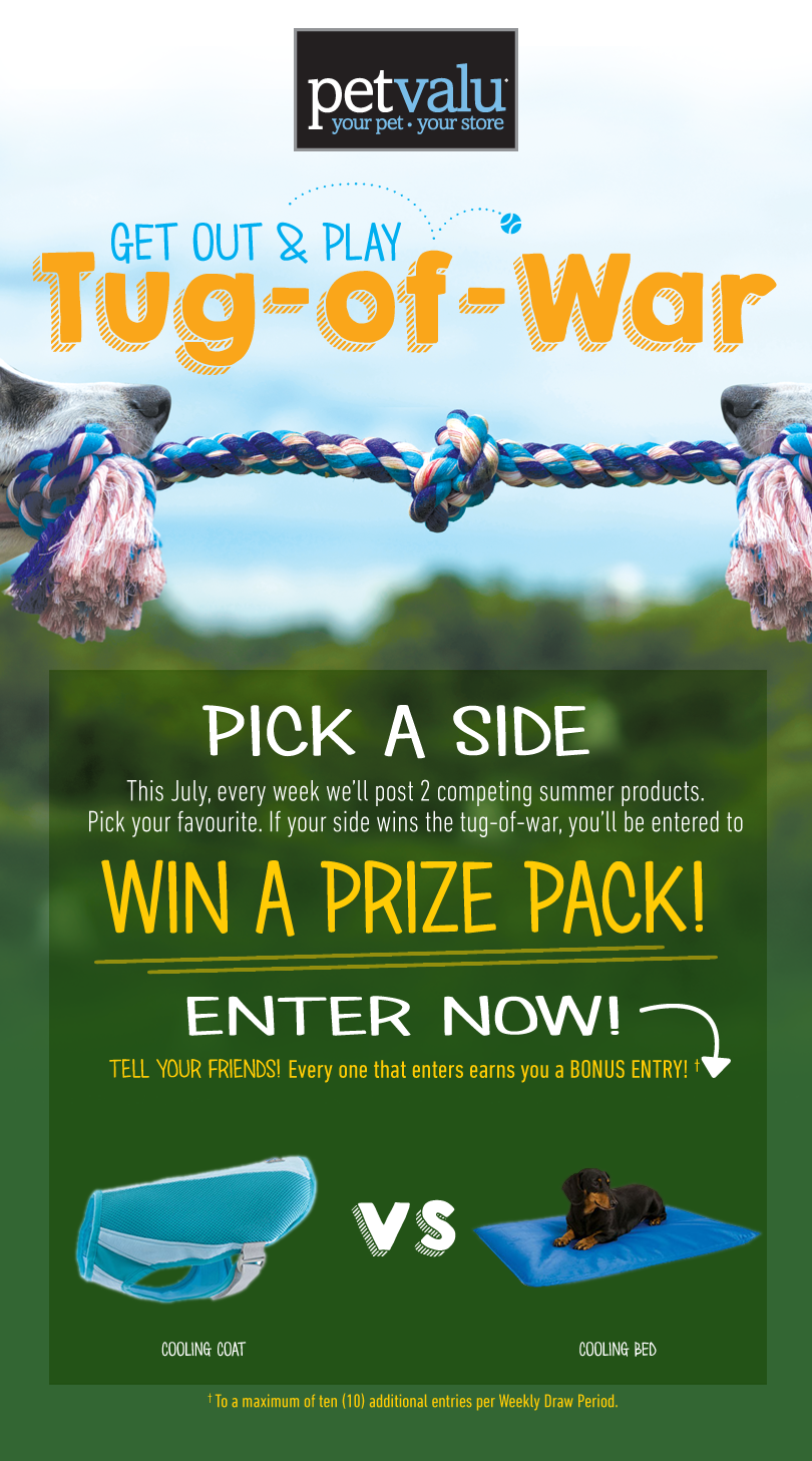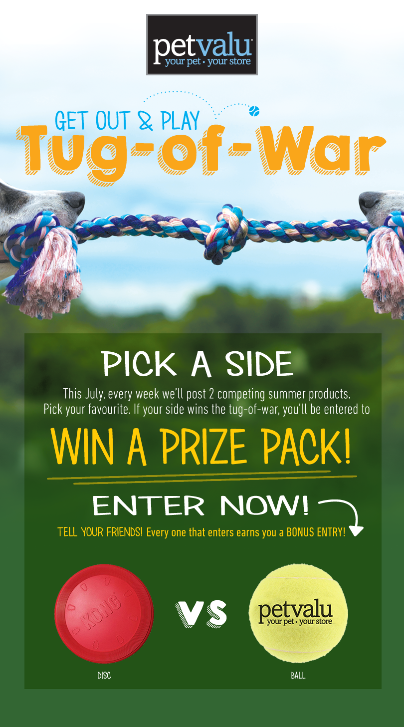 This promotion is in no way sponsored, endorsed or administered by, or associated with, Facebook. You are providing your information to Pet Valu and not to Facebook. The information you provide will be used to help select a winner for our “Get Out and Play Tug-of-War".